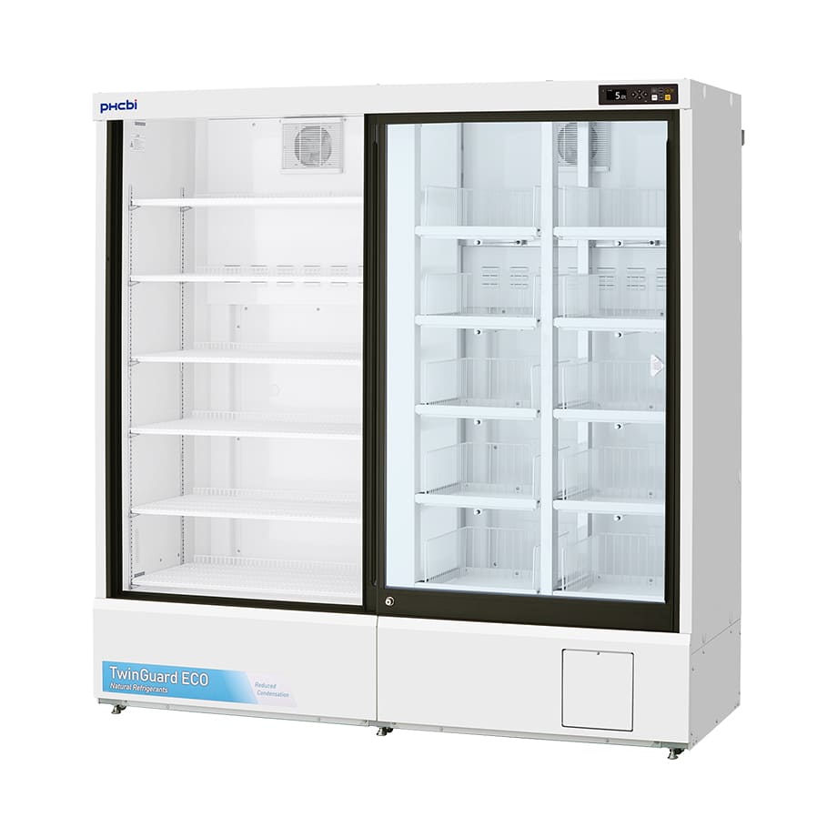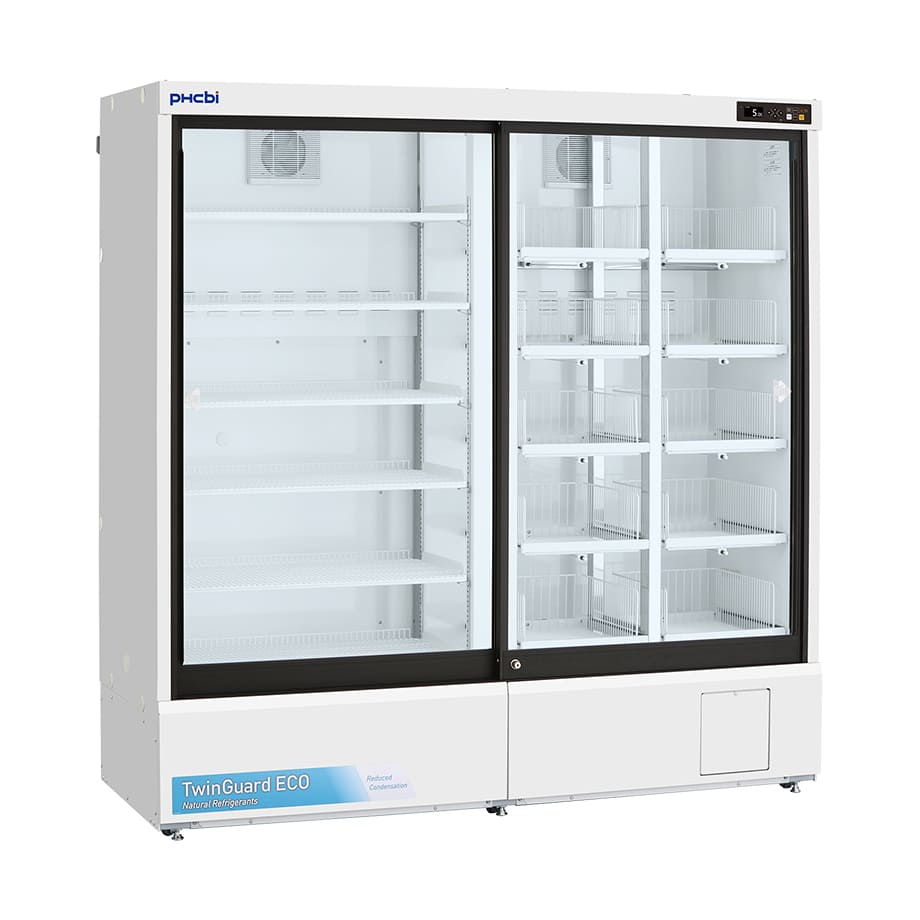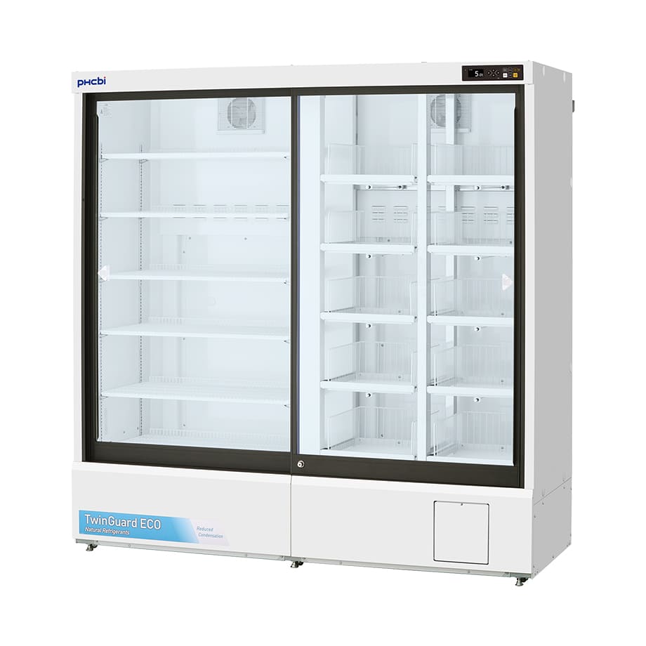 Twinguard Pharmaceutical Refrigerator with sliding door Our MPR-S1201RXH-PE Twinguard Pharmaceutical Refrigerator with sliding door, perfectly preserve samples, reagents, and pharmaceuticals through high-reliability temperature control. Use of natural HC refrigerants combined with inverter controlled compressors, reduces power consumption by approx. 77% compared with existing models. Ultimate Sample Protection A single unit incorporates two independent refrigerating circuits. Should one circuit experience a problem, the other circuit will continue to maintain in-chamber temperature at SV 5°C ± 3°C. The double-safe circuits ensure preserving the crucial stored items with greater safety. Improved Sustainability Natural HC refrigerants, inverter controlled compressors, new Cycle Defrost system, together with enhanced sliding glass doors design, combine to improve temperature management and increase energy efficiency. User-friendly Design The ergonomic design provides a clear view of stored items through the large framed windows. The slim profile allows easy retrieval, and the self closing sliding doors makes them ideal for limited spaces. Environmentally Friendly and Energy Saving 2 Compressors operate in an ON/OFF fashion, “deciding” for the ideal operation. Compressor A and B are controlled on ideal operating patterns, in order to minimize power consumption.