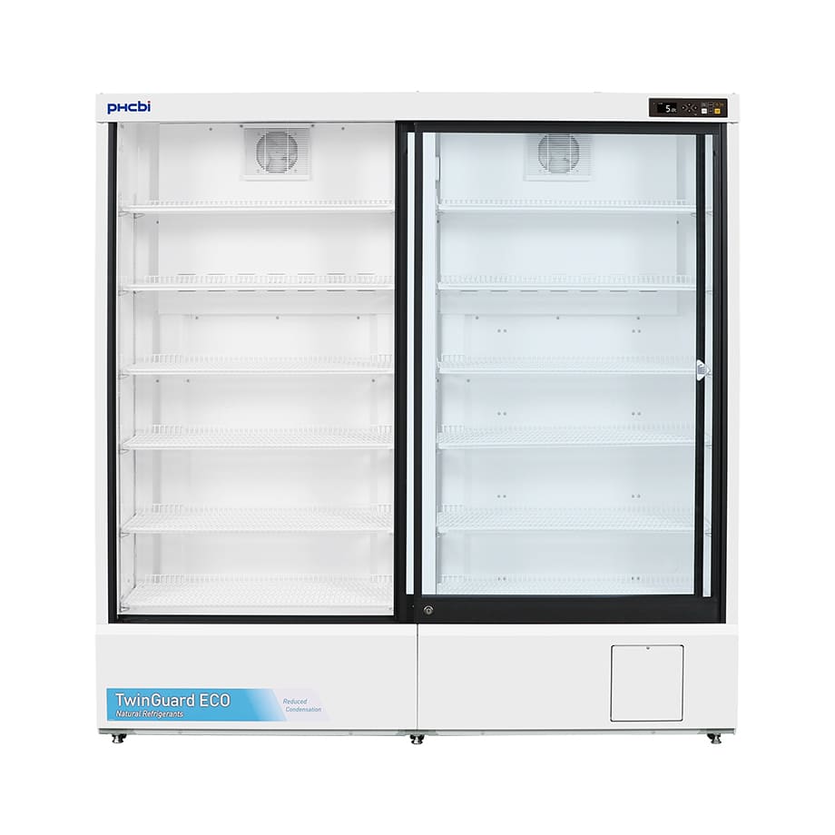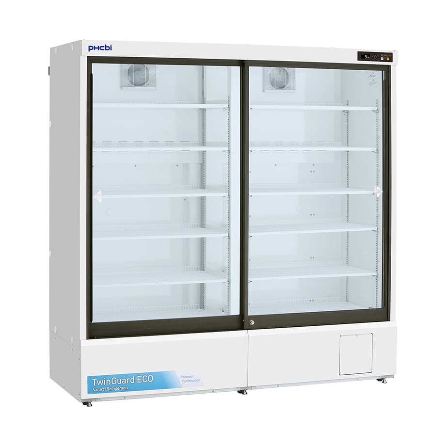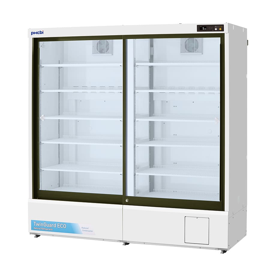 Twinguard Pharmaceutical Refrigerator with sliding door Our MPR-S1201XH-PE Twinguard Pharmaceutical Refrigerator with sliding door, perfectly preserve samples, reagents, and pharmaceuticals through high-reliability temperature control. Use of natural HC refrigerants combined with inverter controlled compressors, reduces power consumption by approx. 77% compared with existing models. Ultimate Sample Protection A single unit incorporates two independent refrigerating circuits. Should one circuit experience a problem, the other circuit will continue to maintain in-chamber temperature at SV 5°C ± 3°C. The double-safe circuits ensure preserving the crucial stored items with greater safety. Improved Sustainability Natural HC refrigerants, inverter controlled compressors, new Cycle Defrost system, together with enhanced sliding glass doors design, combine to improve temperature management and increase energy efficiency. User-friendly Design The ergonomic design provides a clear view of stored items through the large framed windows. The slim profile allows easy retrieval, and the self closing sliding doors makes them ideal for limited spaces. Environmentally Friendly and Energy Saving 2 Compressors operate in an ON/OFF fashion, “deciding” for the ideal operation. Compressor A and B are controlled on ideal operating patterns, in order to minimize power consumption.