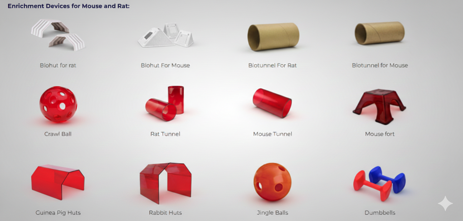 Çevresel Zenginleştirme Cihazları (Environmental Enrichment Devices), laboratuvar hayvanlarının fiziksel ve zihinsel aktivitelerini uyarmak, refahlarını artırmak ve stres kaynaklı anormal davranışları önlemek için tasarlanmış ürünlerdir.