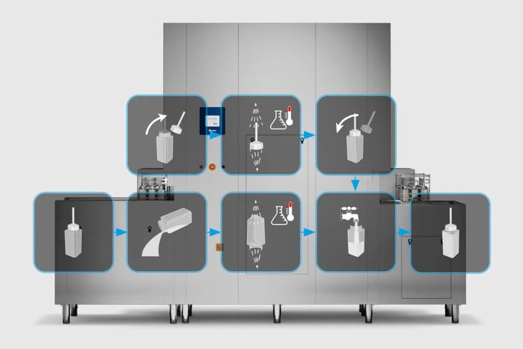 kadar otomatik olarak yıkayın ve durulayın ve farklı tipte şişeleri